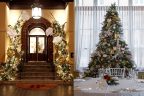 A grand hotel in Italy glows with festive elegance, featuring a gold-lit entrance and an exquisitely decorated Christmas tree in its fine dining area.