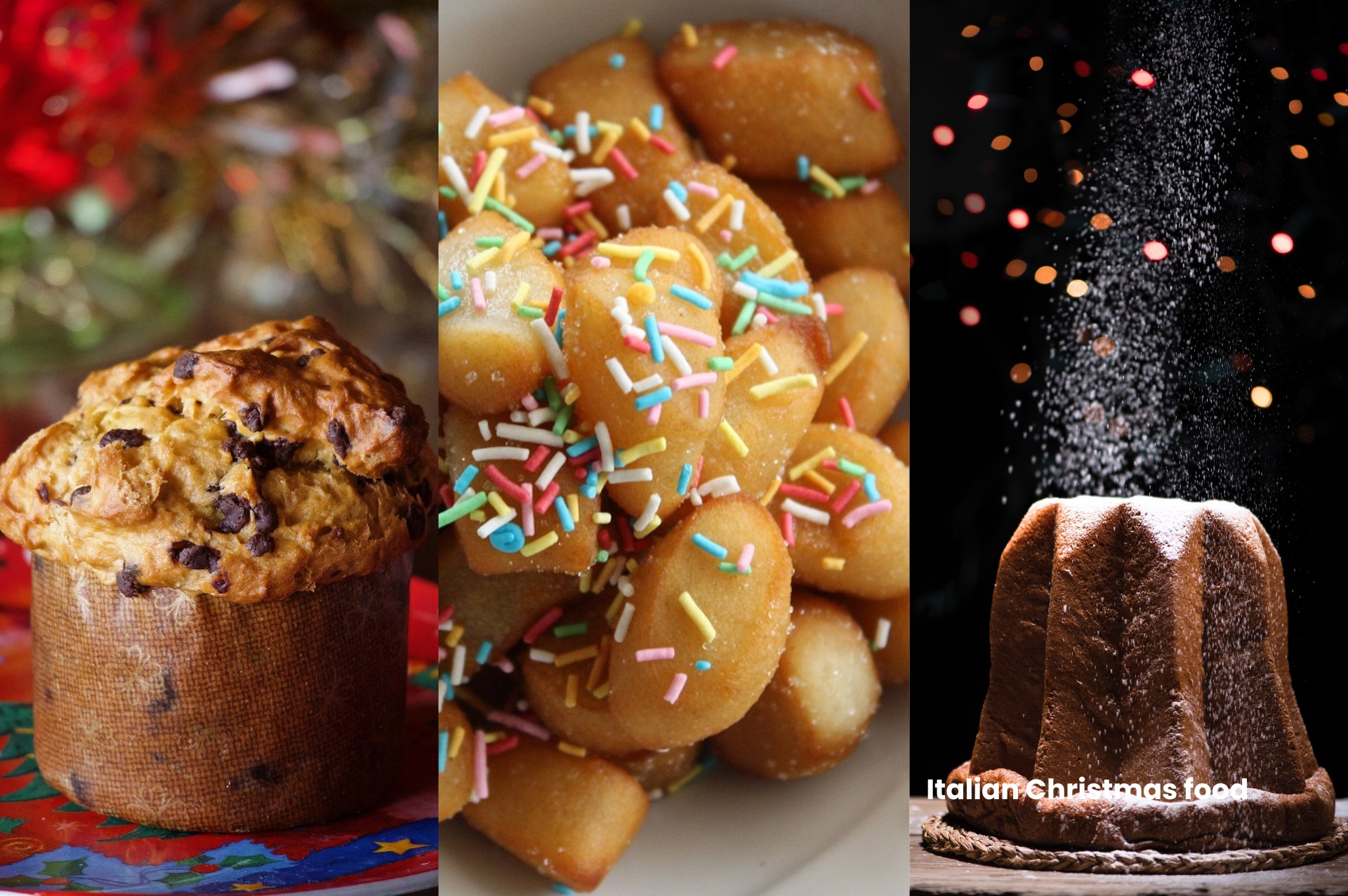 A trio of iconic Italian Christmas desserts—panettone, struffoli, and pandoro—captured with festive sprinkles and holiday lights, celebrating Italy’s sweet seasonal traditions.