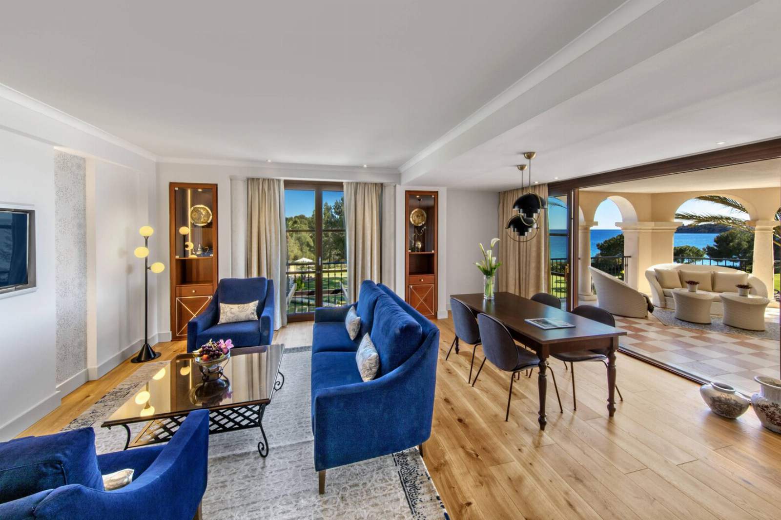 Blue Oasis Suite: The spacious, private Blue Oasis Suite is overly generous in dimension and lavished with hand-picked custom furnishing, unique decorative pieces, the foremost modern local art, thoughtful amenities and every other detail that redefines the finest in luxury resort living. The timeless elegance of the interiors is both beautiful and visually stunning, a symphony of elegant, subtle colours and vibrant Mallorcan architecture. The oversized terrace is an exclusively private enclave with a beautiful garden as a stunning backdrop. In the evening, relax in privacy by embracing the true spirit of the Spanish coastal lifestyle with aperitifs and canapés served by the St. Regis Butler. Inside the extended living area, an intimate dining area with kitchenette and bar seats six. There is a separate bathroom in the hallway and a wardrobe provides additional storage options. The highlights of the capacious bathroom, lined with elegant marble, include a natural stone and wood design.