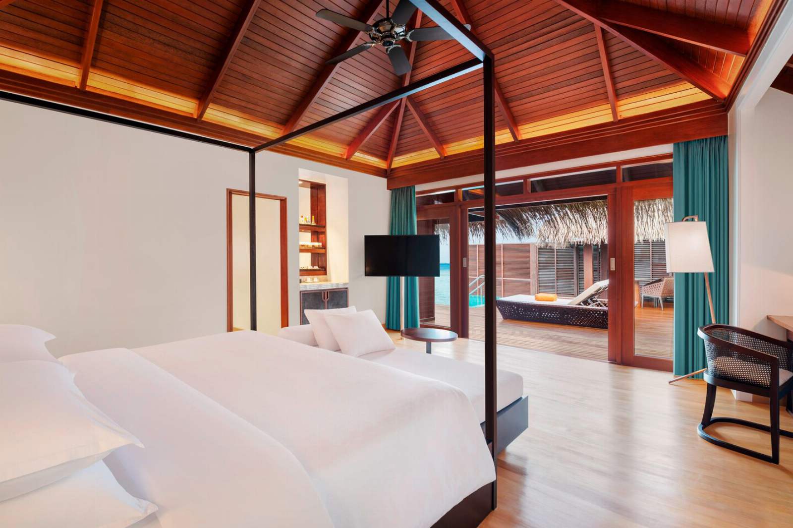 Water Suite pool: Featuring an expansive recreational deck, complete with lap pool, an over-water net, and comfortable sun loungers, the suite boasts floor to ceiling windows for dramatic views of the Indian Ocean. The two bedrooms on either end of the suite are brought together by a spacious open-plan living and dining area; equipped with a kitchenette. Ideal for family or friends gatherings or intimate cocktail parties. They can accommodate 4 guests (84 sqm)