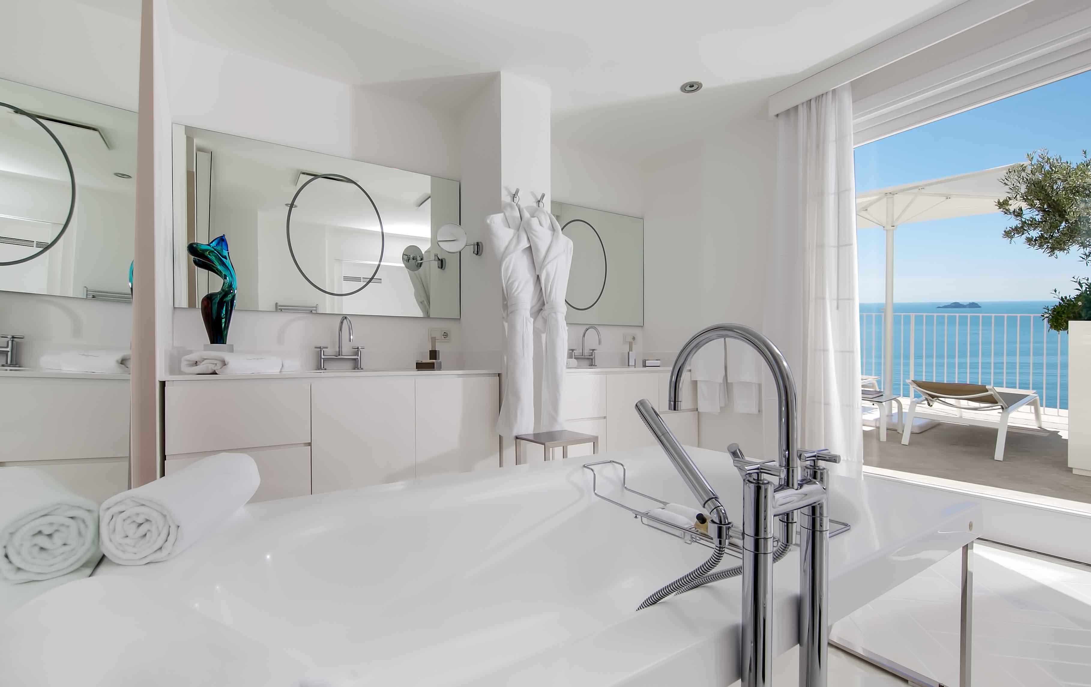 44 Light-filled bedrooms and suites are spacious, pared-down spaces where gleaming white creates a cool and calming vibe. Cosetting and stylish, most have a sea-facing terrace replete with loungers, table and chairs - perfect for cocktails and intimate dining under the Mediterranean sun.