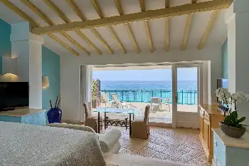 The four Cala del Forte suites offer unparalleled views over the Mediterranean. Their ample interiors and stylish furnishings blend seamlessly with the breath-taking vistas.A private entrance leads to the suites from the shade of a verdant tropical garden. When reserved all together, the suites form a magnificent 400 m² apartment with its own private lobby.The bedrooms offer two double beds, while the bathrooms have a tub and shower. The sleeping areas are set slightly higher than the living room so guests can enjoy the dazzling panorama over the terrace and sea from the moment they awake. Located in an privileged position, the four suites enjoy exclusive access to the heated Castello pool, with direct access to the beach.